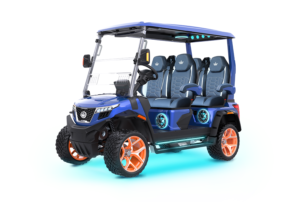 D5 Maverick 2+2 PLUS : This lifted golf cart redefines outdoor exploration. Equipped with under-seat speakers for an immersive audio experience and seamless Apple CarPlay & Android Auto compatibility available. With silent off-road tires, LED lighting and adjustable steering, your drive will be calm and comfortable.