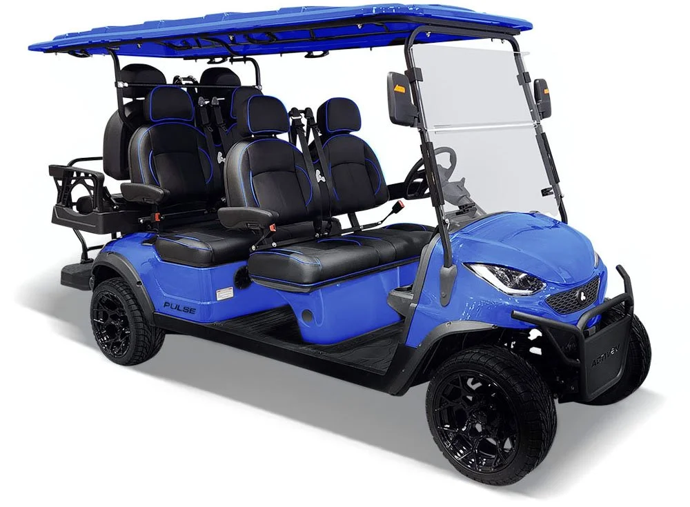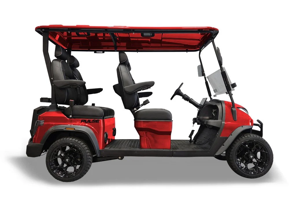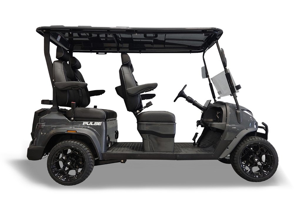 Pulse 6 Seater Non-Lifted : Whether you’re cruising around your community, heading to the pool or beach, or turning heads downtown, this cart delivers luxury, reliability, and fun without the luxury price tag. This cart features a 10.1” touchscreen, 14” wheels, 3 point seatbelts, sport steering wheel, and more!
